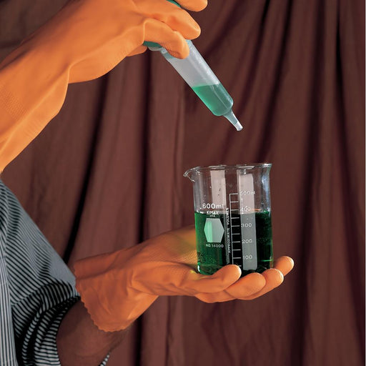 28 mil orange blended neoprene latex glove Flock lined for comfort and ease of removing Component materials comply with all federal regulations fo...