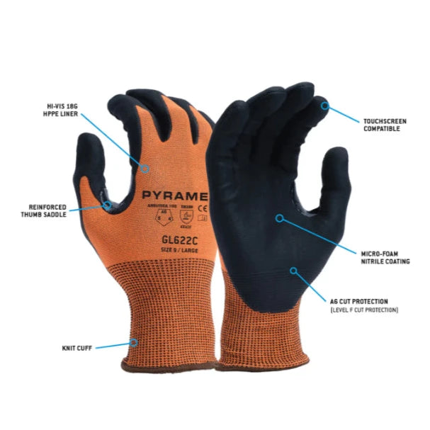 Pyramex® Hi-Vis Micro-Foam Nitrile Safety Gloves - ANSI Cut Level - A6 - GL622C