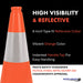 This 18-inch orange traffic cone offers high visibility and superior durability for effective traffic management in all environments. Constructed from flexible PVC with an elastomer blend, it withstands heavy impacts and vehicle runovers without cracking or deforming. Engineered to maintain shape even when twisted 180° or compressed, it quickly reinstates form when repositioned. The wide body and weighted 3 lb recycled PVC base enhance stability on roads, job sites, and parking areas. A 6-inch Type IV retroreflective collar ensures clear visibility both day and night, meeting ASTM D4956-07 and MUTCD standards. With UV resistance, high/low temperature tolerance (-30°C to 65°C), and long-lasting performance, this cone reliably supports lane separation, hazard warnings, and pedestrian control in any weather.