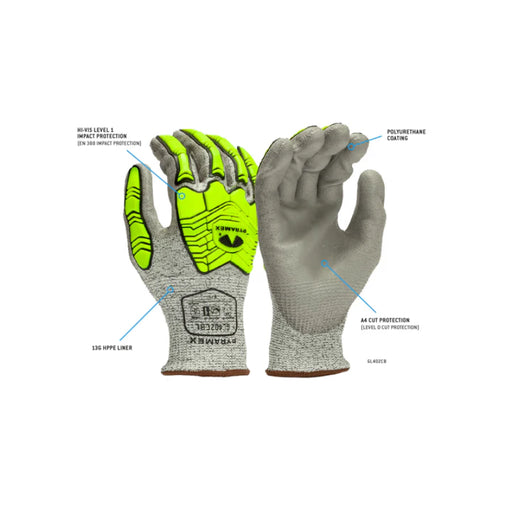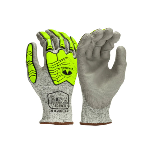 Pyramex® Hi Vis Cut Resistant Gloves - ANSI Cut Level - A4 - Gray - GL402CB Features: Precision Grip: Polyurethane dipped palm and fingers provid...
