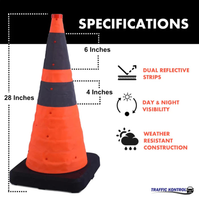 The Traffic Kontrol 28 Inch Foldable / Pop-up Traffic Cones are designed to keep you prepared without sacrificing space, during emergencies strike or roadside hazards appear, the last thing you need is bulky, hard-to-store traffic cones slowing you down. Traditional cones take up valuable trunk space and aren’t always practical for first responders, roadside crews, or anyone on the move. Built with a durable black rubber base and bright waterproof safety orange material, this cone is highly visible and stable, even in high winds or next to fast-moving traffic. Two reflective collars (6" and 4") ensure drivers see you both day and night.