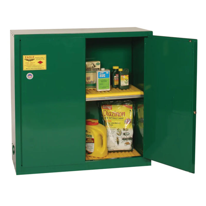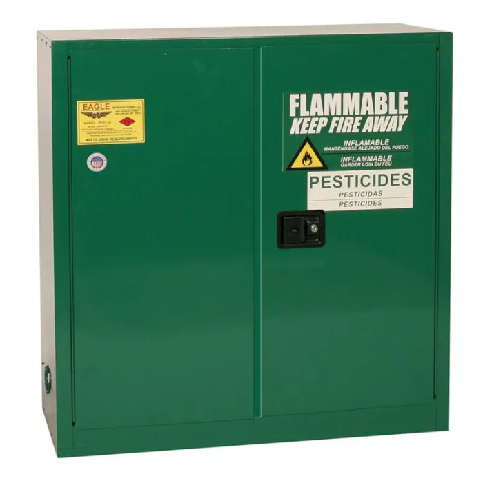 Eagle 30 Gallon, manual close, Pesticide Safety Cabinet provides needed protection for companies who specialize in lawn care, golf course management, agricultural interests or who handle and store pesticides and poisons. Constructed of 18-gauge (1 mm) steel, the sides, top, bottom, and doors are double-walled with a 1-1/2 in (3.8 cm) air space between walls. Includes two vents, each have 2 in (5.1 cm) threaded fittings and a fire baffle and cap. Cabinets have a high gloss powder coat finish with trilingual warning, plus grounding attachment, 3-point latch system, and 2-in (5.1 cm) raised, leakproof door sill. Each shelf is adjustable on 3 in (7.6 cm) centers, supported by 4 brackets, with a 350 lbs (159 kg) safe allowable load. Includes poly shelf and sump trays to help contain small spills and provide extra corrosion protection. Cabinets are FM-Approved and meet NFPA Code 30 and OSHA requirements.