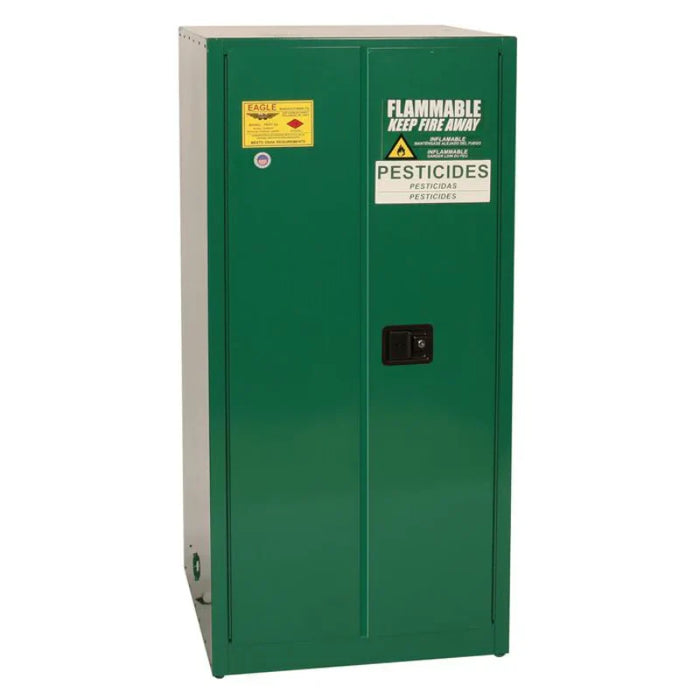 Eagle 60 Gallon, self-closing, Pesticide Safety Cabinet provides needed protection for companies who specialize in lawn care, golf course management, agricultural interests or who handle and store pesticides and poisons. Constructed of 18-gauge (1 mm) steel, the sides, top, bottom, and doors are double-walled with a 1-1/2 in (3.8 cm) air space between walls. Includes two vents, each have 2 in (5.1 cm) threaded fittings and a fire baffle and cap. Cabinets have a high gloss powder coat finish with trilingual warning, plus grounding attachment, 3-point latch system, and 2-in (5.1 cm) raised, leakproof door sill. Each shelf is adjustable on 3 in (7.6 cm) centers, supported by 4 brackets, with a 350 lbs (159 kg) safe allowable load. Includes poly shelf and sump trays to help contain small spills and provide extra corrosion protection. Cabinets are FM-Approved and meet NFPA Code 30 and OSHA requirements.