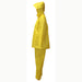 The Cordova Safety Products brand DEFIANCE-FR™ rain gear is constructed of yellow, .28 mm PVC/Nylon fabric. It is self-extinguishing per ASTM D6413 and not designed for Arc Flash. This three-piece rain suit features a detachable hood with drawstring and storm-fly front with snap buttons, bib-style pants with suspenders and a snap fly.