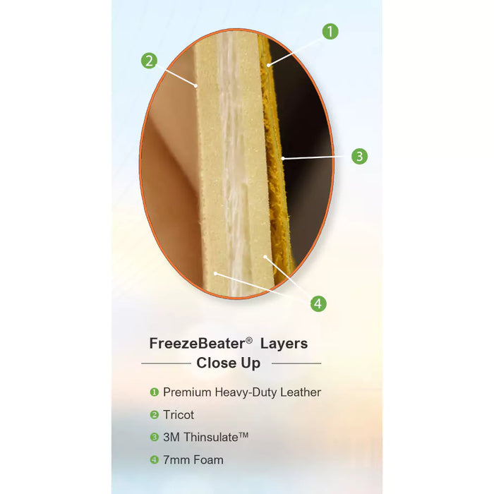 Featuring 3M Thinsulate, the warmest thin insulation on the market, CORDOVA brand FreezeBeater® gloves keep working hands warm and toasty even in the coldest conditions. They feature premium, heavy-duty leather and nylon knit wrists, a triple-layer lining, and continuous pull tabs. The three-layer linings consist of Tricot, Thinsulate® and 7 mm foam.