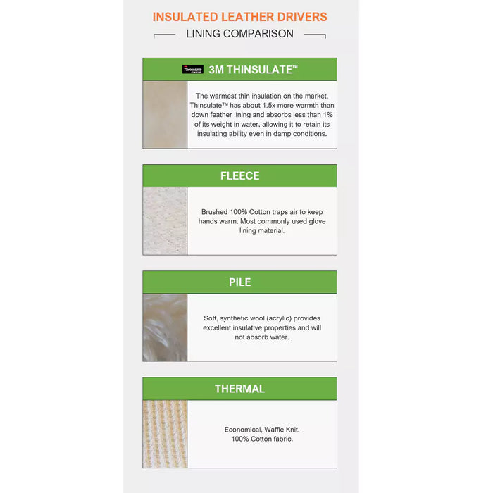 This cowhide, split leather palm is insulated for warmth with pile lining, a synthetic wool. It features a rubberized safety cuff for added protection and gunn cut pattern.