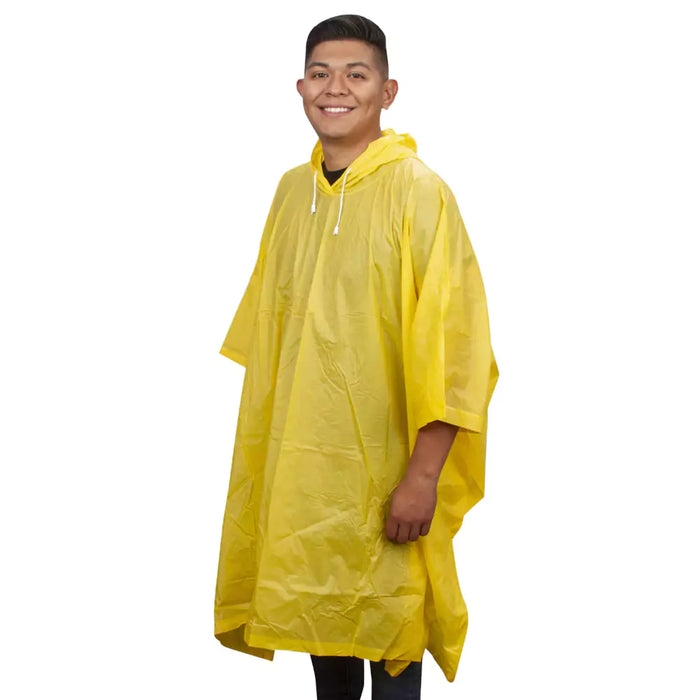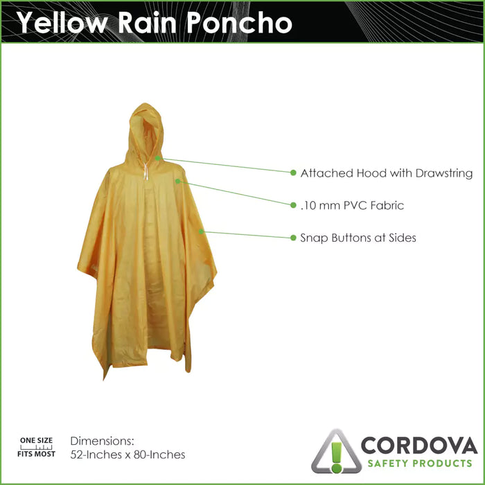 Cordova Safety Products provides affordable, reliable rain protection. This yellow rain poncho is constructed of .10 mm single-ply PVC fabric.  It features an attached hood with drawstring and snap buttons at the sides.