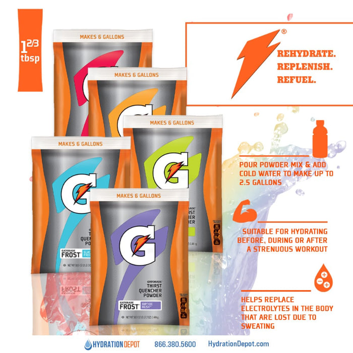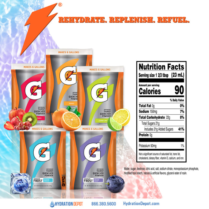 Gatorade Instant Powder 6-Gallon Formula is designed for optimal hydration with a variety of refreshing flavors including Glacier Freeze, Riptide Rush, Fruit Punch, Orange, and Lemon Lime. Each case includes 14 bags, each containing 51 oz of powder that yields 6 gallons, totaling 84 gallons per case—ideal for rehydrating teams during high-endurance or physically demanding activities. With a scientifically balanced mix of electrolytes and carbohydrates, it helps replace what’s lost through sweat to keep your crew performing at their best. Offered in bulk quantities, assorted bundles, and pallet deals, it’s a cost-effective hydration solution for safety managers and event coordinators. Whether on industrial sites, at marathons, or large gatherings, Gatorade Instant Powder ensures fast, effective hydration whenever and wherever it's needed most.