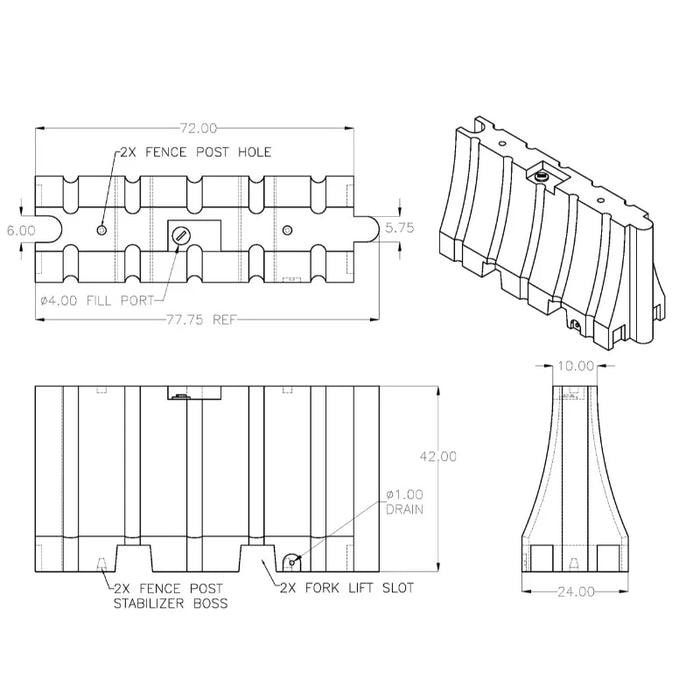 42" H x 72" L x 24" W plastic jersey barriers have been tested and approved by the US Dept of Transportation. Made from UV-Resistant Polyethylene, this portable and durable safety plastic jersey barrier is structurally sound and impact resistant. It can be easily relocated and reconfigured and is ballast able with sand or water for added stability. It also features built-in molded forklift slots for maximum convenience. Great for road work or parking lot construction projects. The water-filled plastic jersey traffic barrier will not bulge or distort when filled with water ballast or sand. We also will not jeopardize our quality just to sell our barrier. During the design of the plastic jersey barrier, we take into account that cosmetics are also a key selling point in our desired markets. We believe that we have a product that is more cosmetically pleasing than our competitors. This heavy-duty traffic barrier has also been designed to a higher standard of strength and integrity which we feel makes for a superior product for the end-user. as a Test Level 2 Longitudinal Channelizing Device “ AASHTO Manual for Assessing Safety Hardware Test Level 2. It was stated to be acceptable as a TL2 water-filled channelizer. We do have a letter with all the testing results if any further questions need to be answered regarding the testing. Most of our barriers now have fill lines. We recommend only filling the barriers to the fill line “ overfilling can cause bulging. To keep water from freezing inside our suggestion is to use Calcium Chloride. You use 4-6 oz of Calcium Chloride per gallon depending on the temps outside.