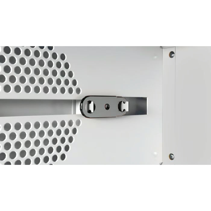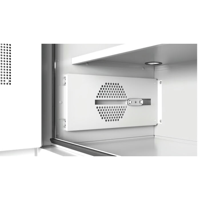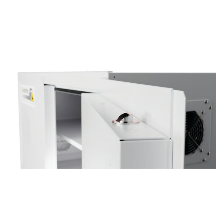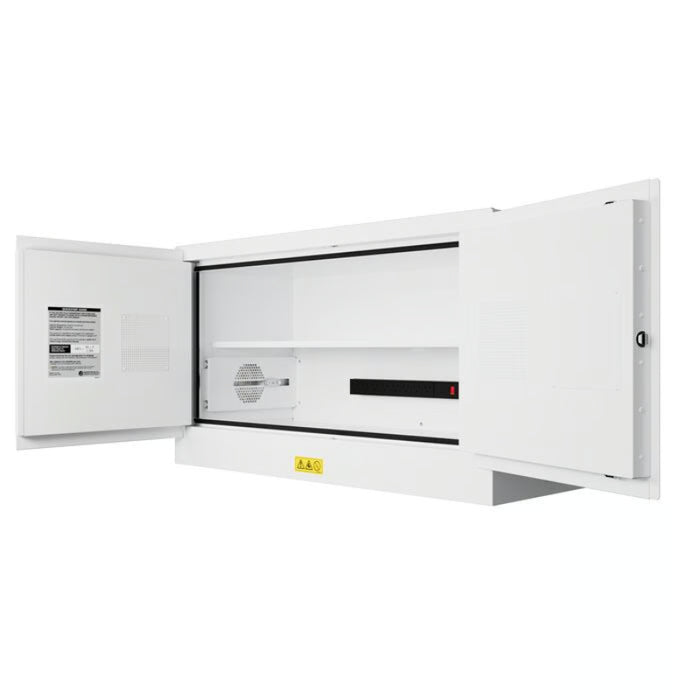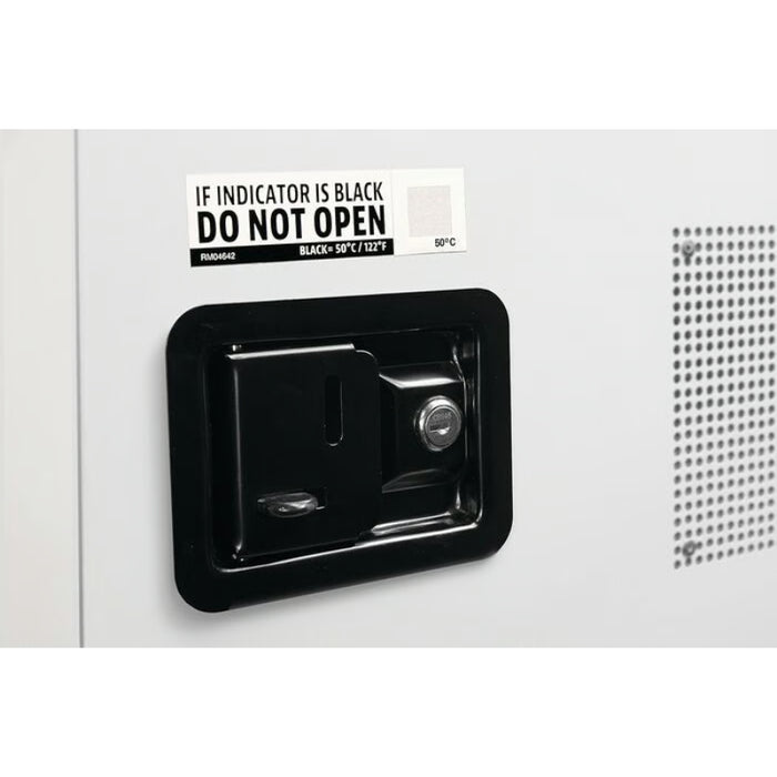 - Includes a fixed shelf with a safe load capacity of 65 lbs and an axial fan to regulate temperature, with sliding doors that close if internal temperatures exceed 135°F.