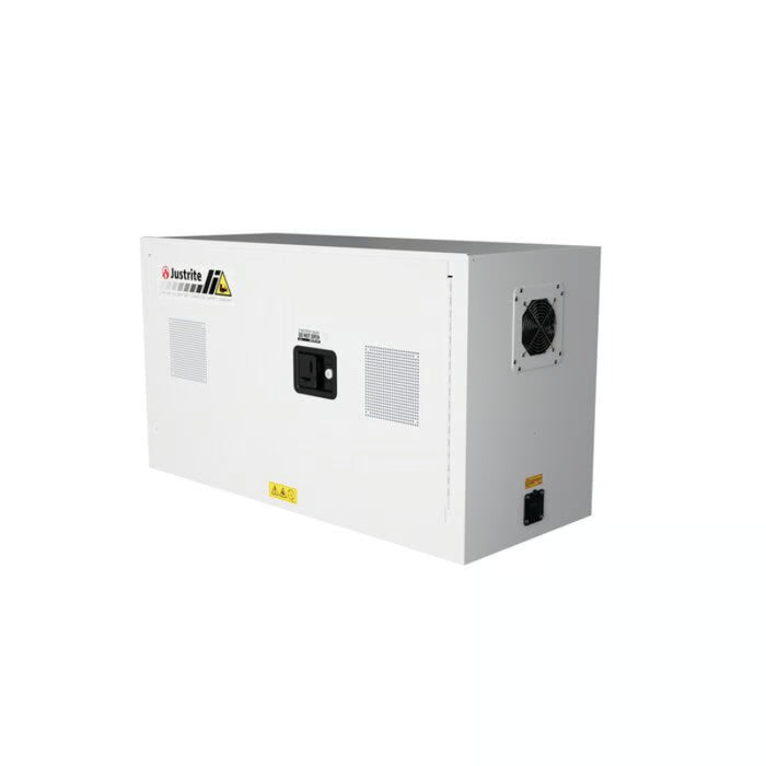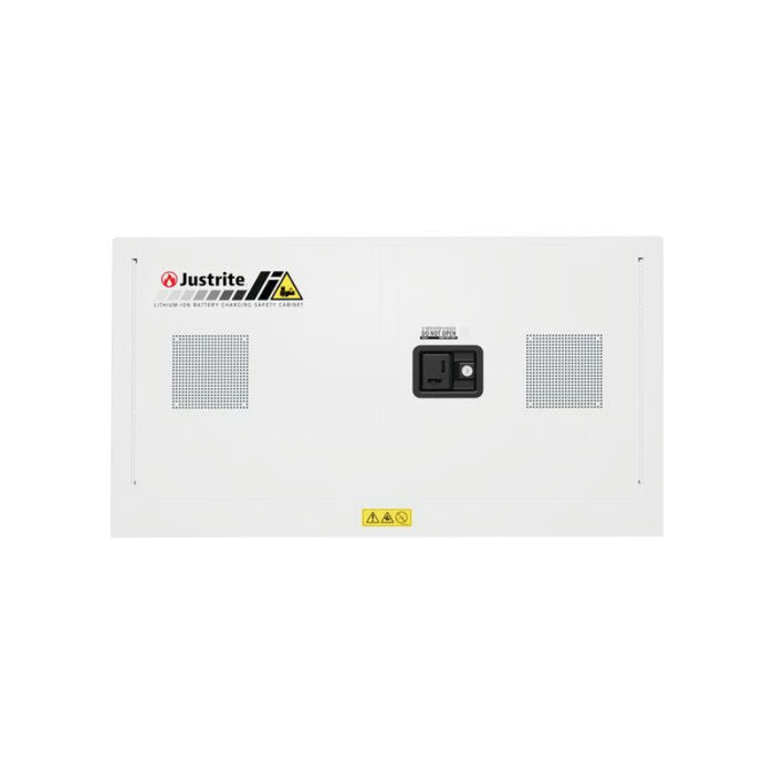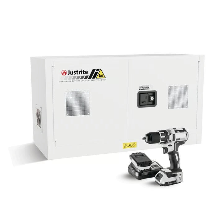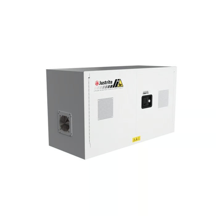 Introducing Justrite's lithium-ion battery charging and storage cabinet, equipped with ChargeGuard™ technology for unparalleled safety. This innovative cabinet is designed with advanced multi-layer protection to minimize the risks of battery fires and thermal runaway.