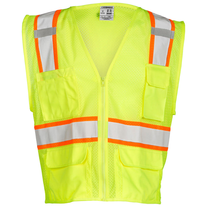This vest is made from Ultra-Cool 100% polyester mesh for superior breathability and comfort. It features a zipper front closure and 2-inch wide high-performance reflective material with 3-inch breathable contrasting color for enhanced visibility. Designed for functionality, it includes left and right chest mic tabs, two lower outside patch pockets with flaps, a right chest 2-tier pencil pocket, and a left chest radio pocket with a flap. Additionally, two inside patch pockets provide extra storage, making this vest a practical and reliable choice for safety and convenience in the workplace.