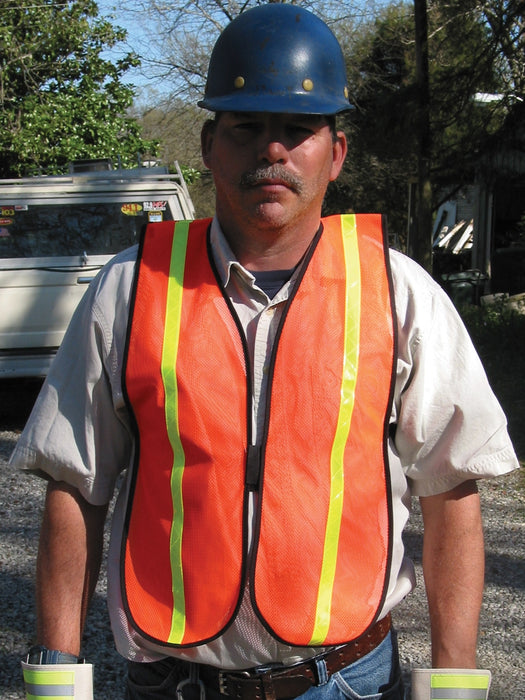 These general purpose mesh safety vest will cover you in bright Fluorescent Orange or Fluorescent Lime colors and help you to stand out and be seen in your surroundings. One size fits most unless otherwise stated. Available in a variety of configurations and colors. The V211R is an orange polyester lightweight mesh vest with ¾ inch reflective stripes. It features a hook and loop tab front closure and has an elastic strap on each side. Not ANSI rated. If you are looking for the best safety vest options, look no further than MCR Safety's wide assortment of hi-visibility products.