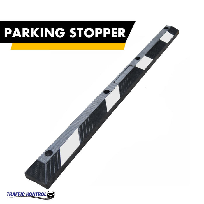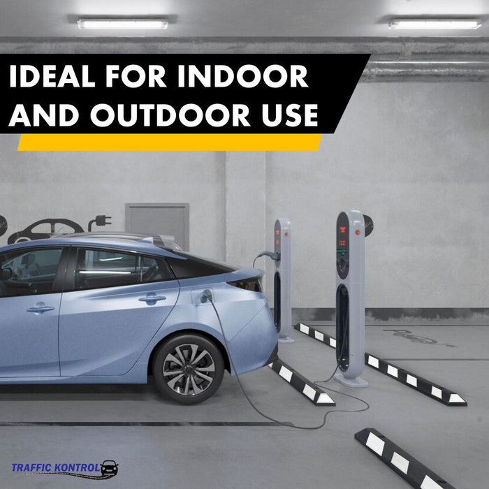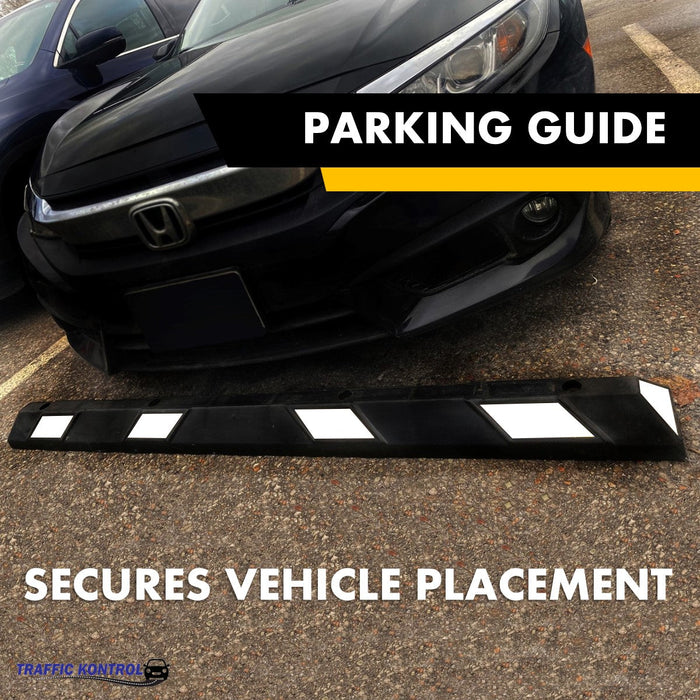 Unlike concrete or plastic, which necessitate frequent replacements, recycled rubber car stops are safer and more durable. In-molded highway reflective tape (available in yellow or white) ensures visibility and pedestrian safety. The traffic control parking curb wheel stopper is constructed of 100% recycled rubber. The Traffic Kontrol rubber parking wheel stop comes with pre-molded holes and you can buy Spikes separately. They are lightweight and flexible; conforming to the contour of uneven road surfaces. rubber car stops are available in 6′ lengths.