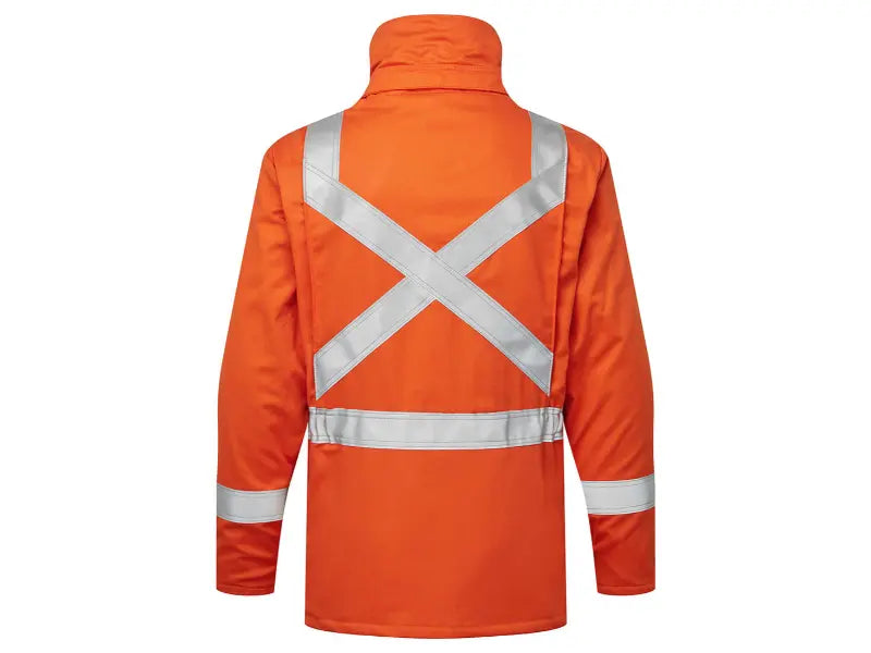 This versatile garment offers multi-purpose protection from electric arcs, flash fires, and molten ferrous metal. It features planted fleece-lined hand pockets, an inner chest pocket, and an H2S monitor attachment option with strap and elastic fasteners. The lowered X-striping on the back provides extra space for a company logo or hooded undergarments. With a two-way zipper and options to zip in an orange fleece, navy fleece, or orange freezer jacket, it ensures flexibility and comfort. Made from Westex UltraSoft® fabric, composed of 88% FR Cotton and 12% Nylon for both shell and lining, it meets stringent safety standards including NFPA 2112 and NFPA 70E.