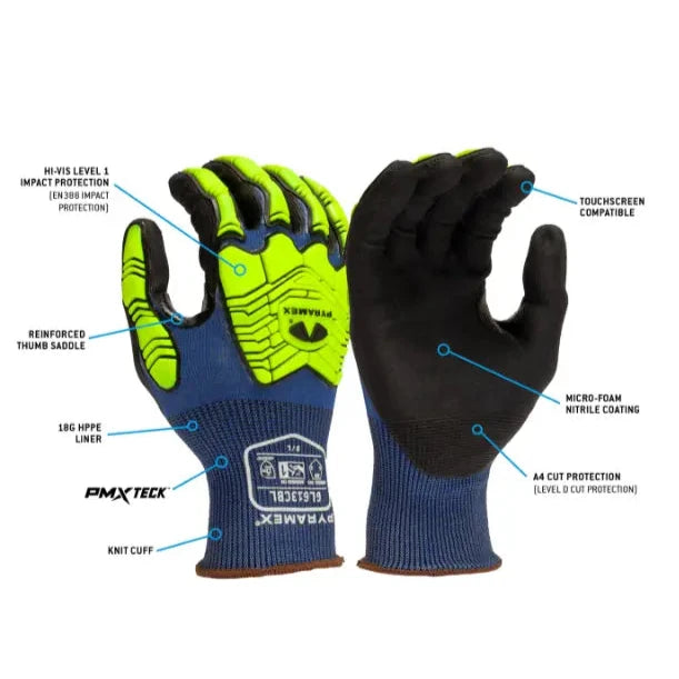 Enhanced by custom-designed hi-vis impact protection, reinforced thumb saddles,
