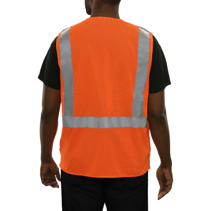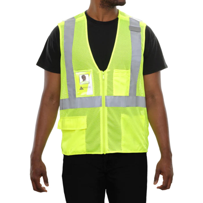This Hi-Vis Safety Vest is ANSI Class 2 Compliant with a 5pt Breakaway design. Made with lightweight, comfortable and durable 3.1oz Polyester Mesh, the safety vest has a clear hook & loop closure credentials pocket, two large inside pockets, one large outside pocket, cell phone & pen/pencil pockets, a mic tab and a breakaway zipper front closure. Our High Visibility Safety Vest features ANSI/ISEA 107-2020 Reflective Material.