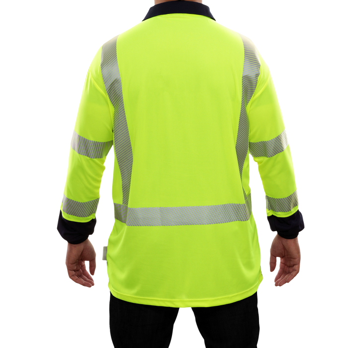 This High Visibility Long Sleeve Safety Polo Shirt is ANSI Class 3 Compliant. Made with lightweight 4.1 oz Birdseye Knit Polyester. It feels butter soft on the inside, yet is work-wear durable. It features a rib knit navy collar and 3-buttoned placket for a professional appearance The performance fabric wicks away moisture 3 times faster than cotton. Our High Visibility Shirt is compliant to ANSI/ISEA Class III for increased conspicuity. In addition, the 3M™ Scotchlite™ Reflective Material – 5510 Comfort Trim adds extra comfort and does not buckle or rub like sewn on reflective tape.