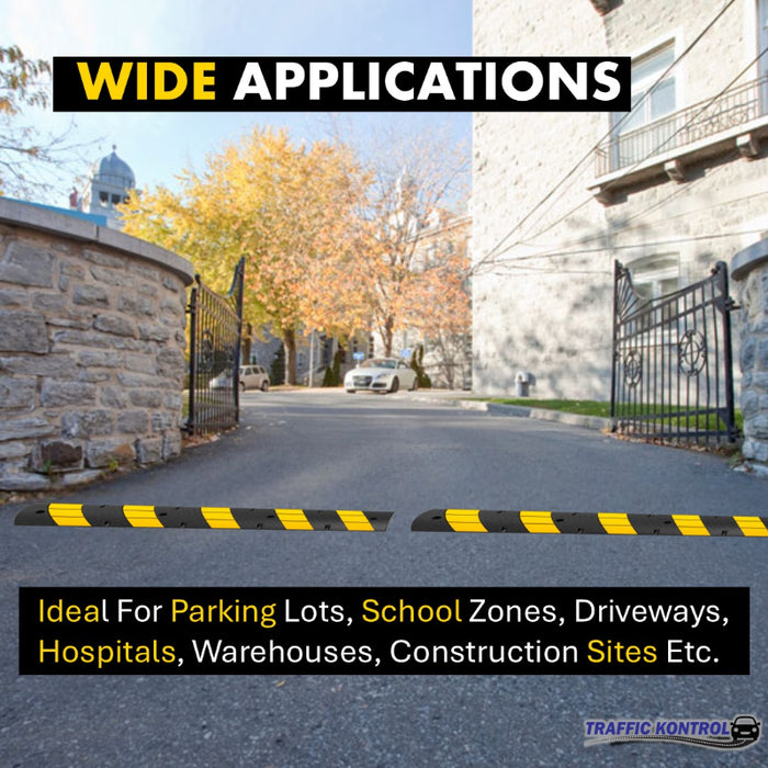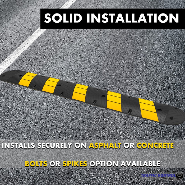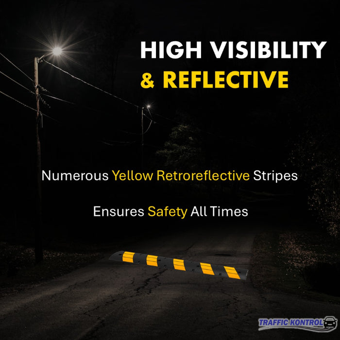 Made from industrial-grade rubber, this heavy-duty speed bump handles constant vehicle impact without cracking or breaking. The bold yellow and black stripes combined with reflective surfaces keep the bump visible to drivers during the day and night, making it easy to enforce lower speeds even in poor lighting conditions. Slowing drivers down shouldn’t be a hassle. This 6-foot long rubber speed bump offers a fast, durable solution to calm traffic and protect pedestrians. Whether you manage a parking lot, school zone, private road, or residential area, this speed bump gets drivers to slow down, safely and effectively.