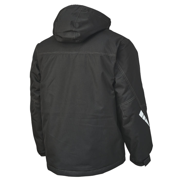 This jacket features durable 600D Poly Oxford waterproof and breathable fabric with 5000/5000 MVP/24hr² protection, a water-repellent finish, and abrasion-resistant construction. It offers warmth with brushed tricot body lining and 6 oz polyester insulation. Designed for functionality, it includes a detachable hood, reflective enhancements, multiple pockets (inside, media, and security), adjustable storm cuffs, and a shock cord drawstring hem. Modern details like contrast stitching, seam sealing, and an embroidery access zipper add style and utility, making it a versatile choice for tough conditions.