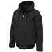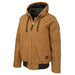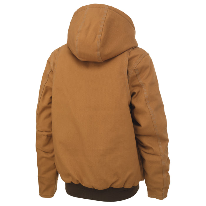 Crafted from 100% cotton 12 oz premium duck fabric with a durable water-repellent finish, this garment is built for durability and weather resistance. The quilted 6 oz polyester insulation provides exceptional warmth, while triple-stitched seams and brass rivets at stress points ensure lasting strength. Practical features include an action back for enhanced mobility, an attached hood with a drawstring for adjustable coverage, and multiple pockets, including an upper zipper pocket, two front scoop pockets, and inside media storage. Rib-knit storm cuffs seal out the cold, while a brass zipper adds durability and a classic touch.