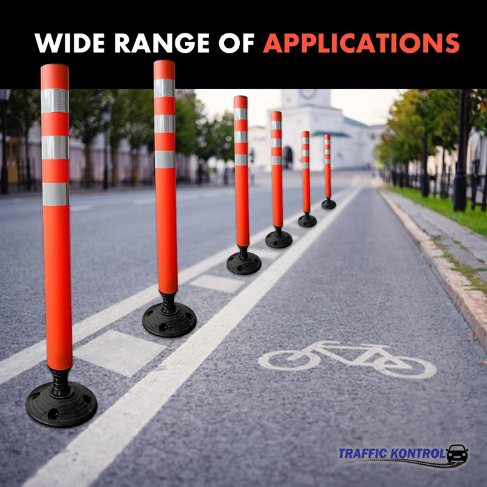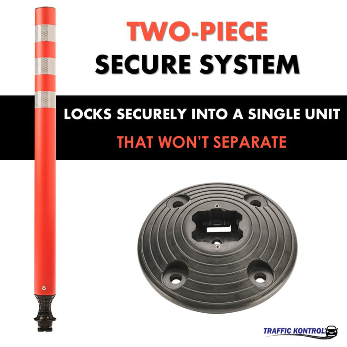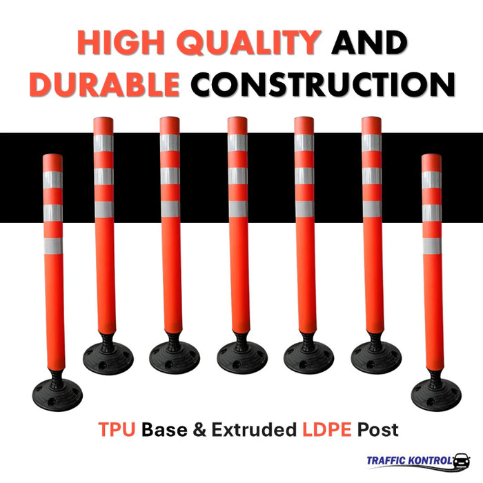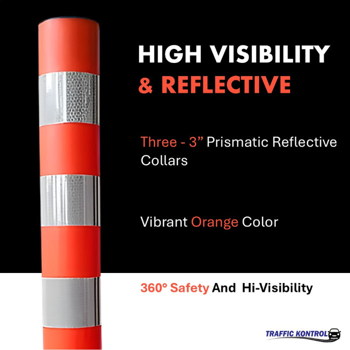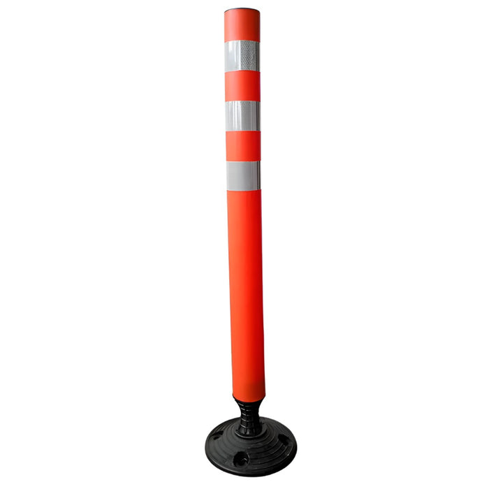 This high-performance Flexible delineator post is designed for maximum visibility, durability, and safety in high-traffic areas. Engineered with a rugged injection-molded TPU base and an extruded LDPE post, it withstands harsh conditions and repeated impacts. The two-piece construction interlocks to form a single inseparable unit, resilient even under the weight of heavy trucks. Featuring a 360° reflective surface with three 3-inch reflective stripes, this post ensures outstanding visibility from any angle, day or night. The proven reactive spring assembly allows the post to rebound fully from impacts in any direction, maintaining long-term performance and reliability.