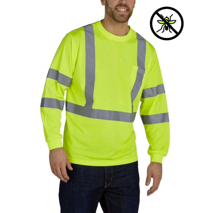 The Utility Pro™ UHV867 HiVis Long Sleeve Tee is protected with PERIMETER™ Insect Guard and non-staining odor-free formula. This long sleeve is made with birdseye knit polyester which makes for a lightweight and breathable fit. ANSI Certified Class 3. Our non-staining odor-free formula guarantees Utility Pro™ wears unparalleled protection for more than 50 Industrial washes, keeping the wearer safe while neutralizing insects. Whether your day job is landscaping or escaping the everyday, Utility Pro™ clothing protected by PERIMETER™ Insect Guard lets you keep going while stopping insects in their tracks.